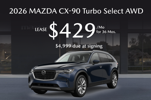 7,500 miles/year. No security deposit required. Monthly payment includes $750 acquisition fee. Excludes tax, title, license, and dealer options and charges.Terms available on approved credit only to very well-qualified lessees through Mazda Financial Services and participating dealers. Lease example based on vehicle MSRP of $40,330 plus $1,495 destination charge (Alaska $1,540). Payment based on capitalized cost of $39,276. Dealer contribution may vary and could affect lease payment. Individual dealer prices, other terms and offers may vary. Must lease from participating dealer’s stock and terms are subject to vehicle availability. Lessee responsible for maintenance, excess wear and use, and will pay $0.15 per mile for all mileage over 7,500 miles per year. Purchase option at lease end for $24,198 plus tax. $350 disposition fee is due at lease end. Void where prohibited. Offer ends 4/30/2026 and you must take delivery prior to expiration of offer. See participating Mazda Dealer for complete details.